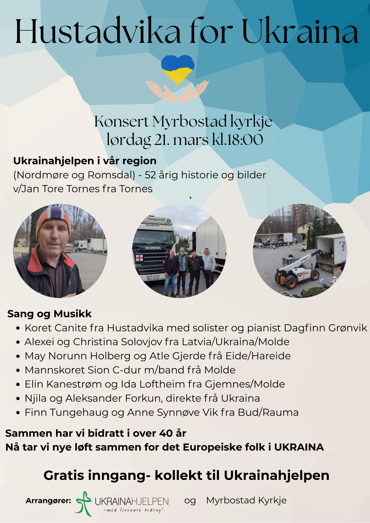 Lørdag 21. mars blir det stor konsert i Myrbostad kyrkje i anledning Ukrainahjelpens 52-årige historie.