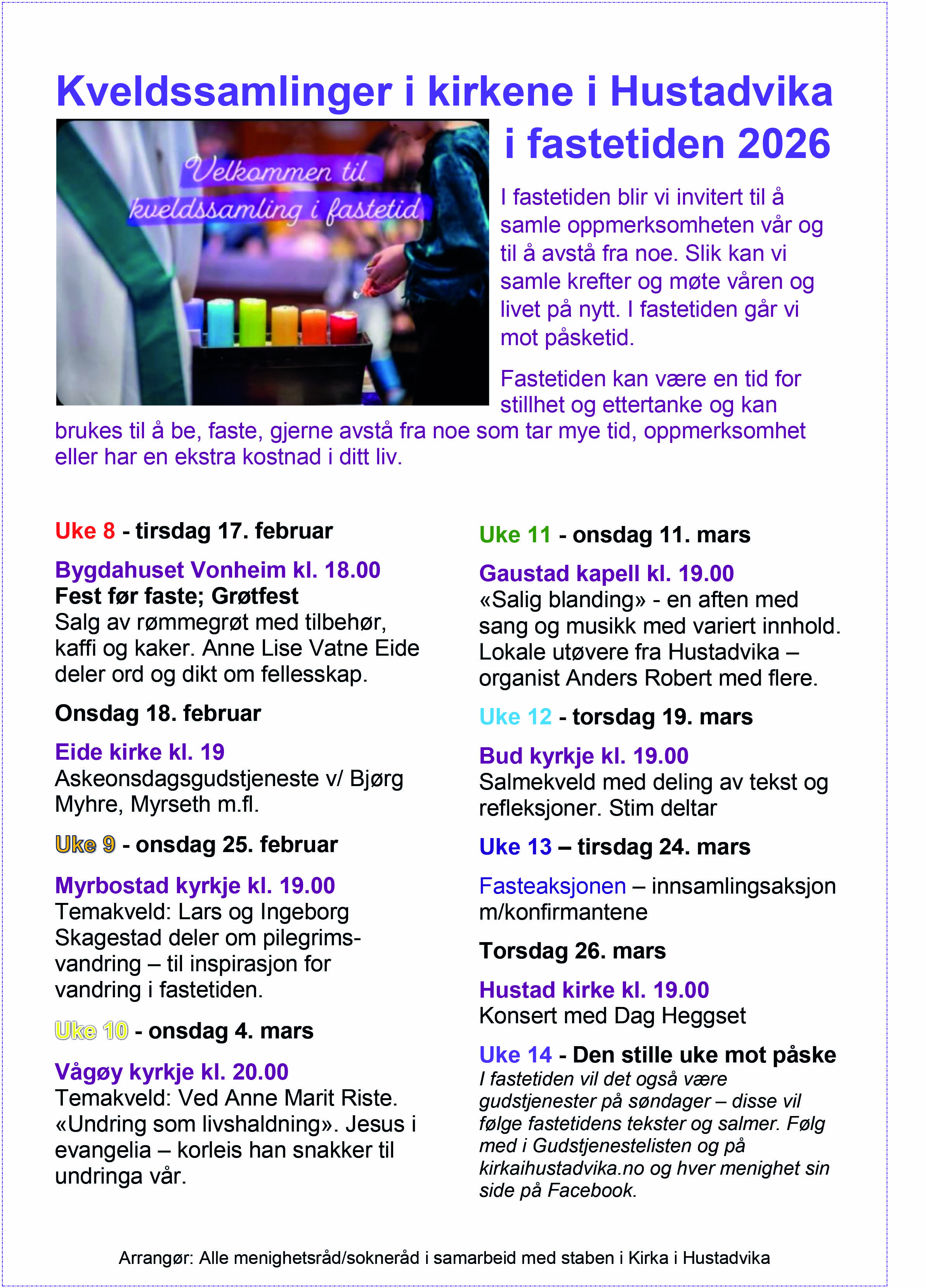 I tiden mellom fastelavnsøndag og palmesøndag vil menighetene i Hustadvika arrangere kveldssamlinger midt i uka i tillegg til søndagenes gudstjenester. Noen er på onsdagskveld og noen er torsdagskveld. Se mer her om hva vi vil presentere.